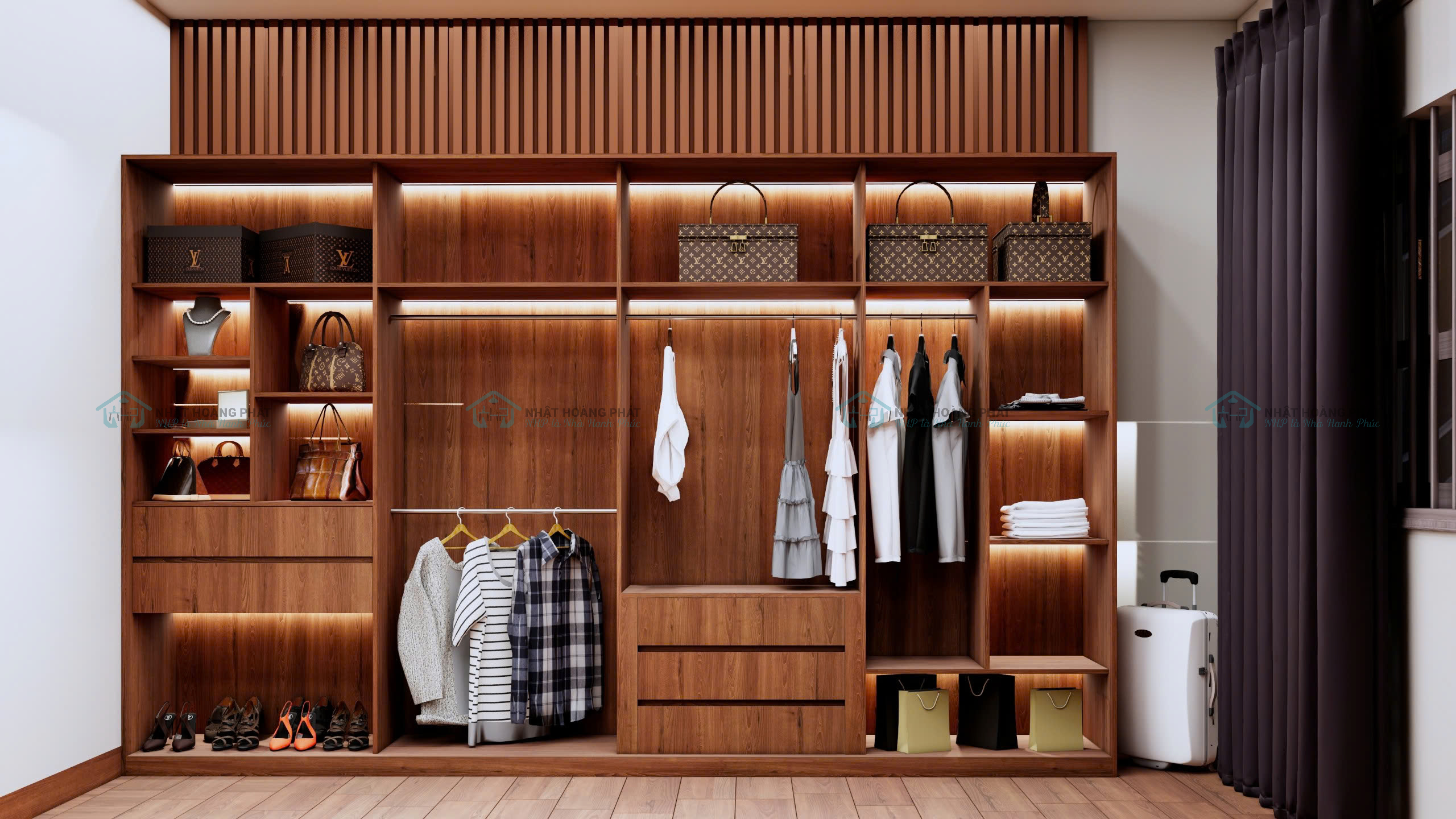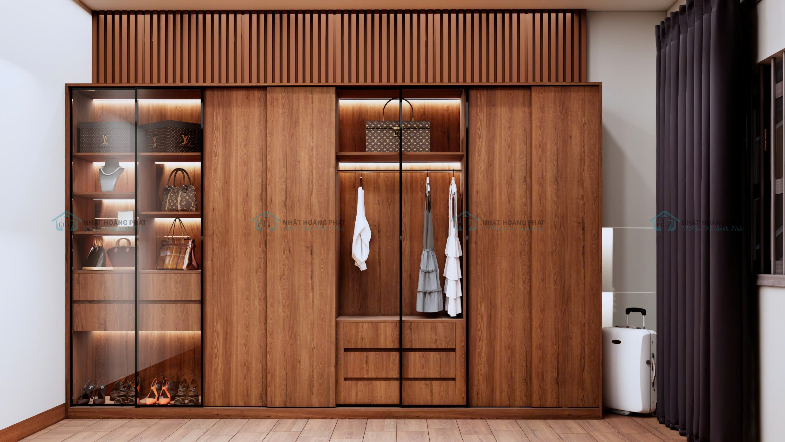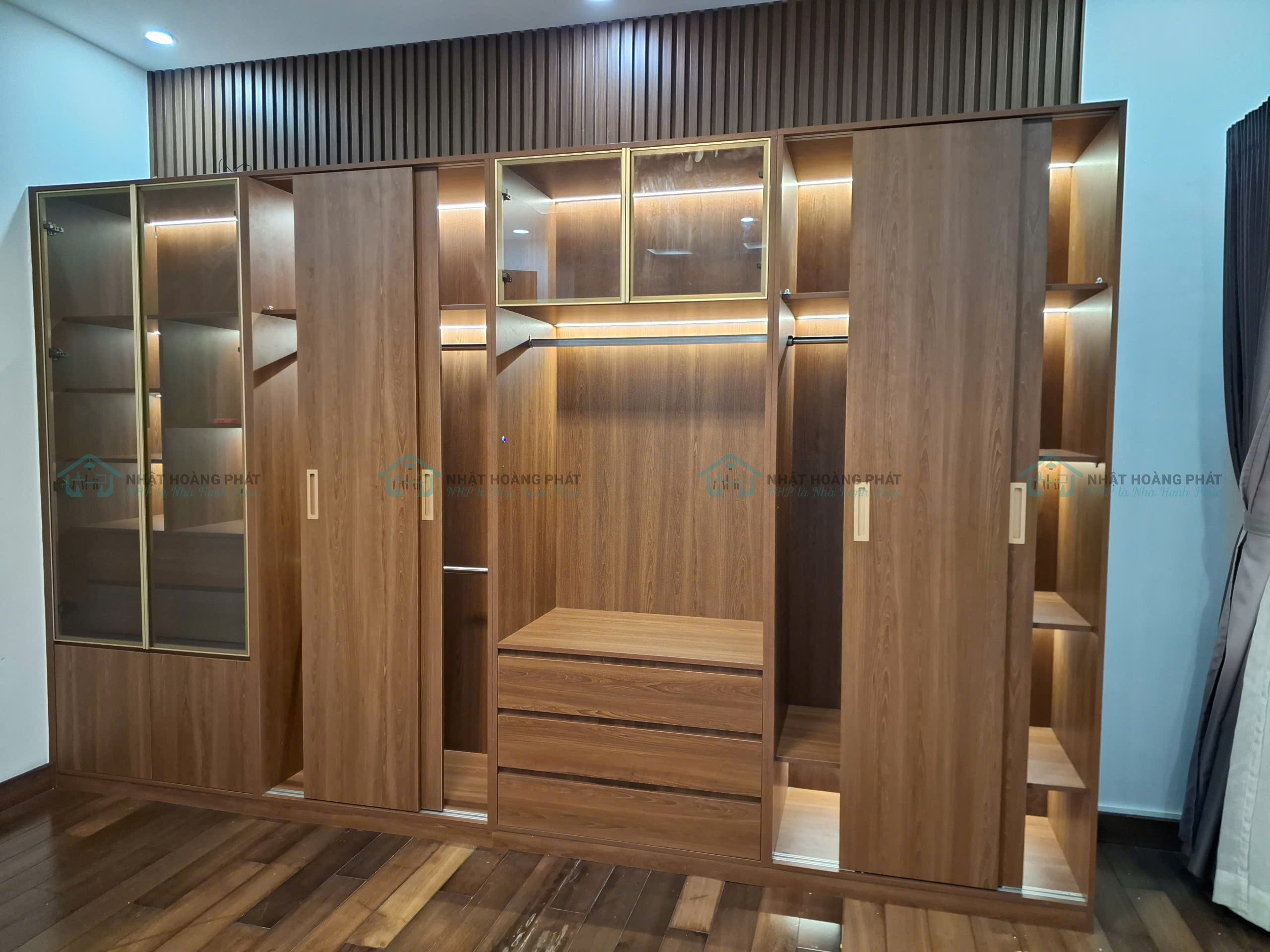 Tủ áo lớn: có kích thước 3.68 x 2.3 mét. Thân tủ MDF chống ẩm phủ Melamine. Được chia làm 4 buồng, 2 buồng cánh lùa bằng ván phủ Melamine và 2 buồng cánh mở bằng kính khung nhôm. Bên trong được chia thành nhiều ngăn kệ, hộc kéo, thanh treo phù hợp với nhu cầu sử dụng của chủ nhà. Tất cả đều dùng phụ kiện giảm chấn chất lượng, chịu lực tốt, độ bền cao, đóng mở nhẹ nhàng. Tủ còn được trang bị đèn led và cảm biến đóng mở.