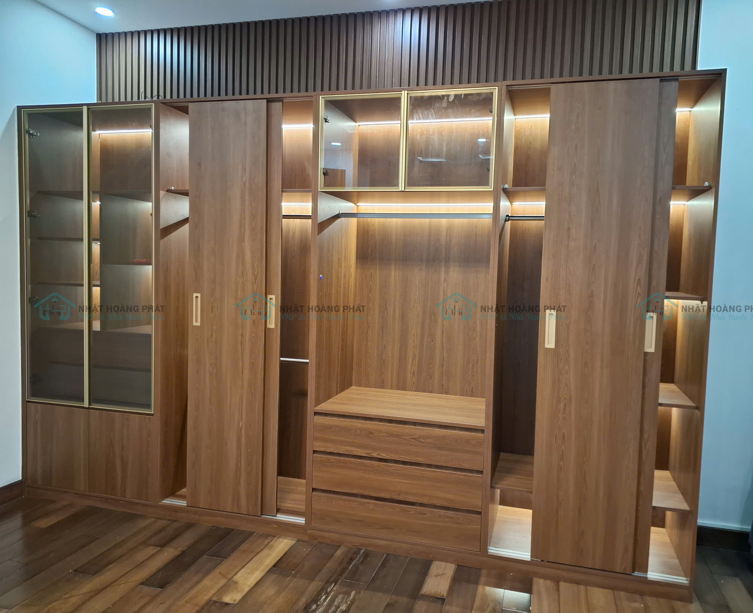 Ốp vách lam nhựa PVC trang trí trên đầu tủ quần áo.