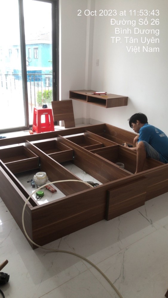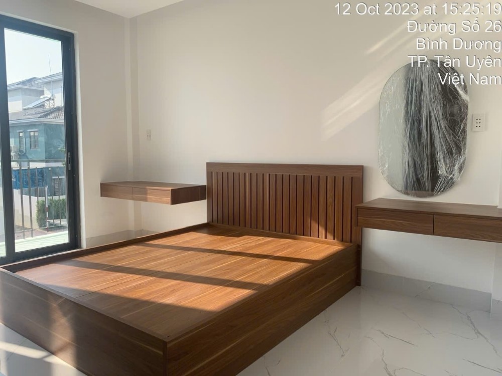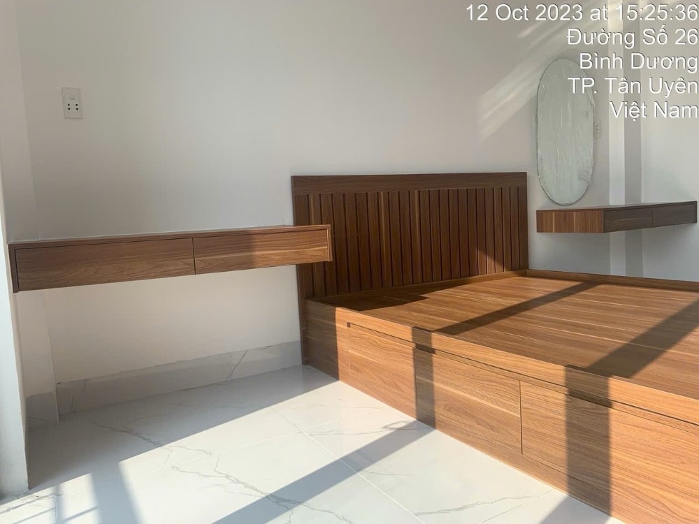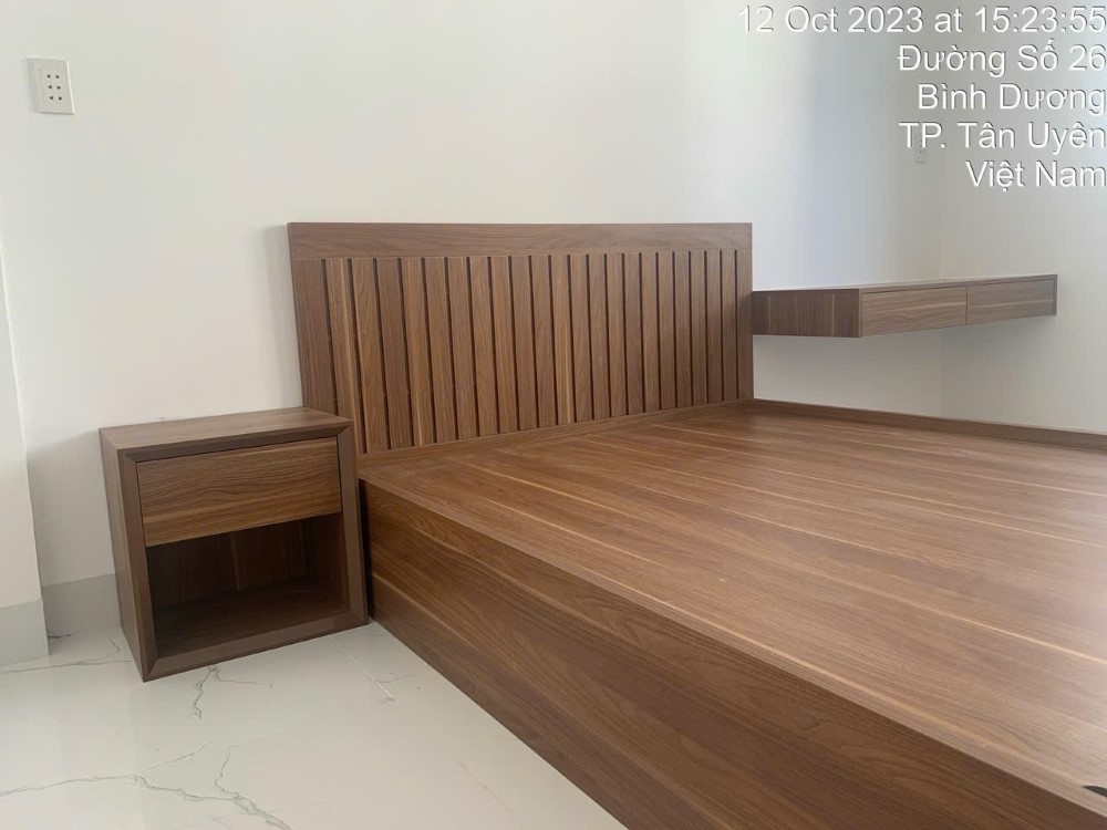 - Chất liệu: MDF chống ẩm phủ Melamine, vạt giường 9mm phủ Melamine