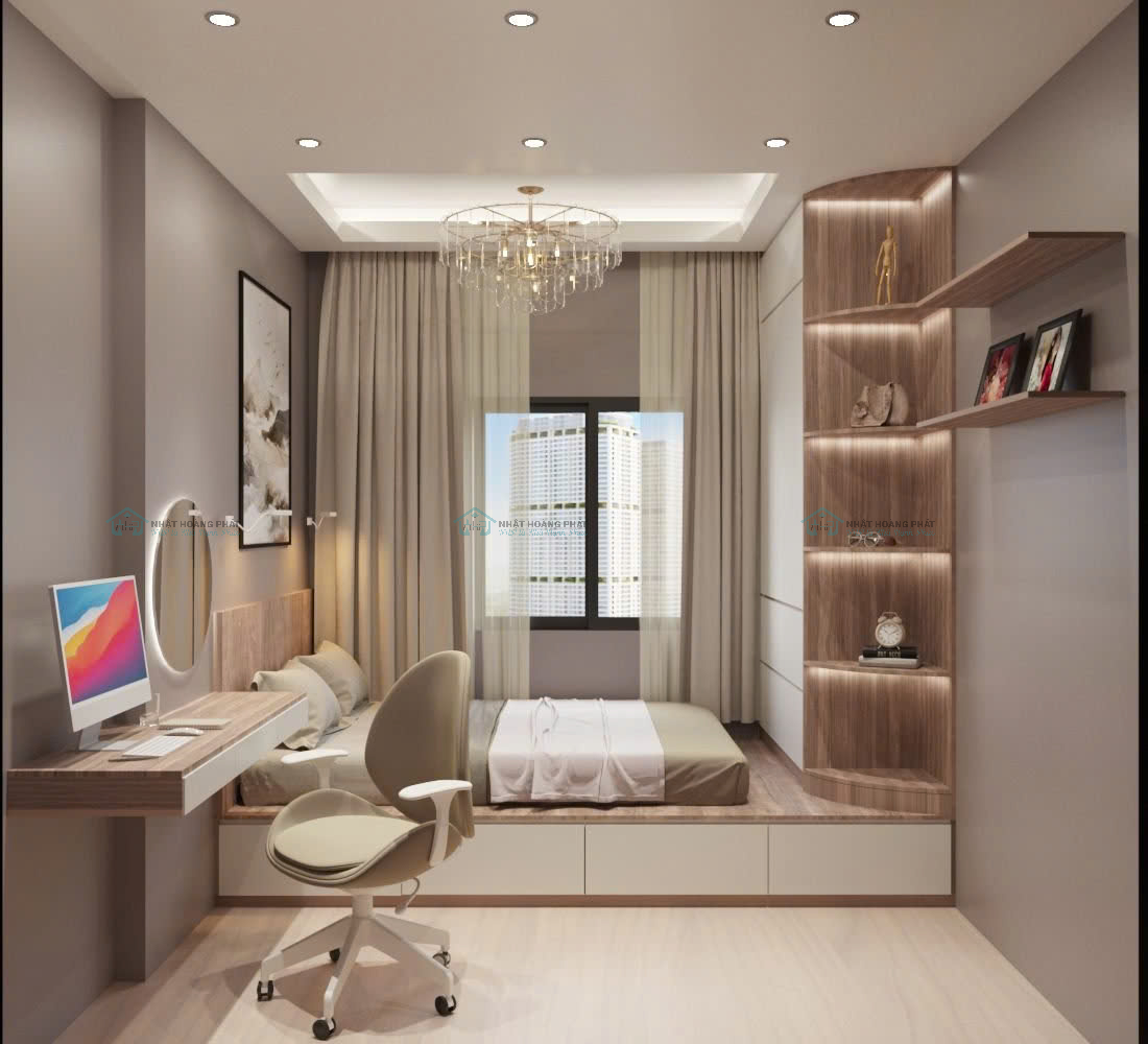 Với căn hộ 2 phòng ngủ, việc tối ưu công năng là yếu tố then chốt. Thiết kế nội thất phòng ngủ sử dụng giường ngủ MDF chống ẩm phủ Melamine. Kiểu dáng đơn giản nhưng tinh tế, kết hợp tủ quần áo cánh lùa giảm chấn, tiết kiệm không gian. Tạo nên sự tiện dụng, ngăn nắp và thoáng đãng hơn.
