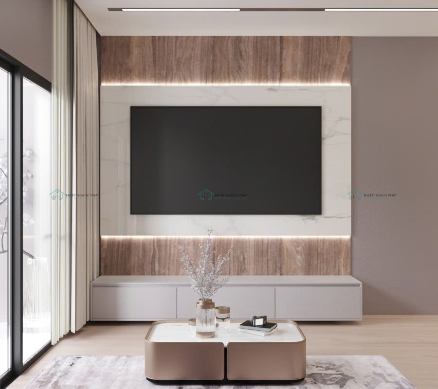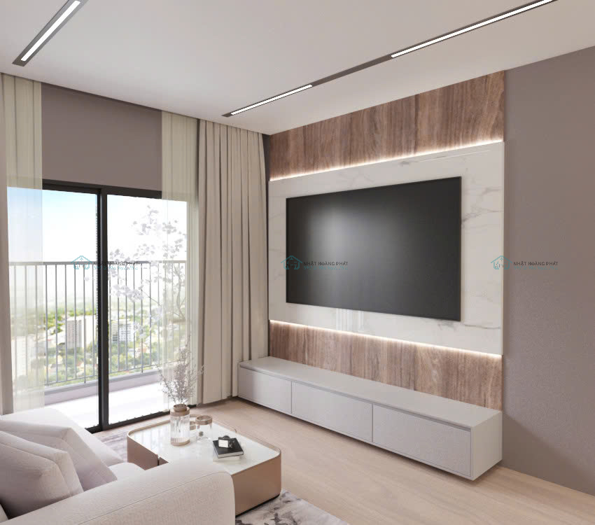 Phòng khách được định hình bởi vách ốp trang trí vị trí TV và kệ tivi MDF phủ Melamine. Tạo điểm nhấn hiện đại, đồng bộ với tổng thể căn hộ. Các mảng ốp phẳng, đường nét tối giản giúp không gian thêm phần thoáng đãng, tinh gọn mà vẫn thể hiện gu thẩm mỹ của gia chủ.