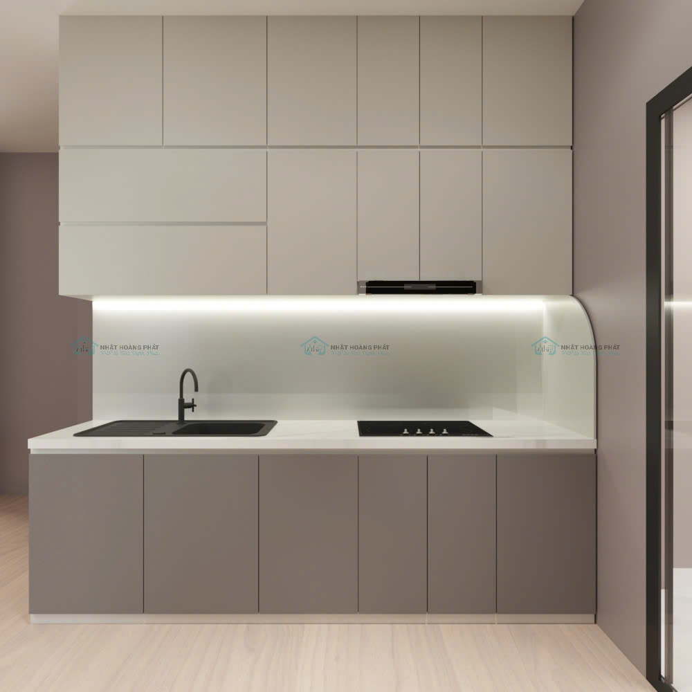 Bếp được xem là “trái tim” của căn hộ, nơi cần sự sắp xếp khoa học và vật liệu bền bỉ. Tủ bếp MDF chống ẩm phủ Melamine được thiết kế với tone màu trắng và xám kết hợp. Bề mặt nhẵn mịn dễ lau chùi, giúp không gian luôn sạch sẽ và hiện đại.