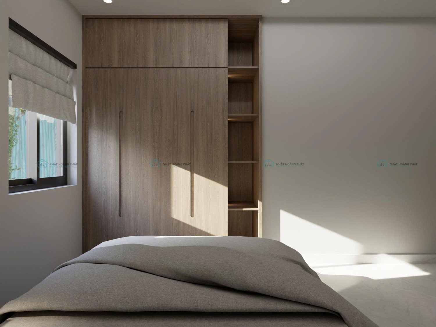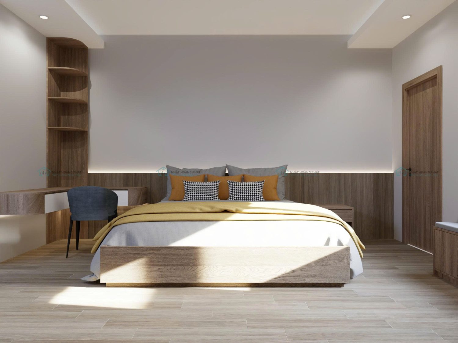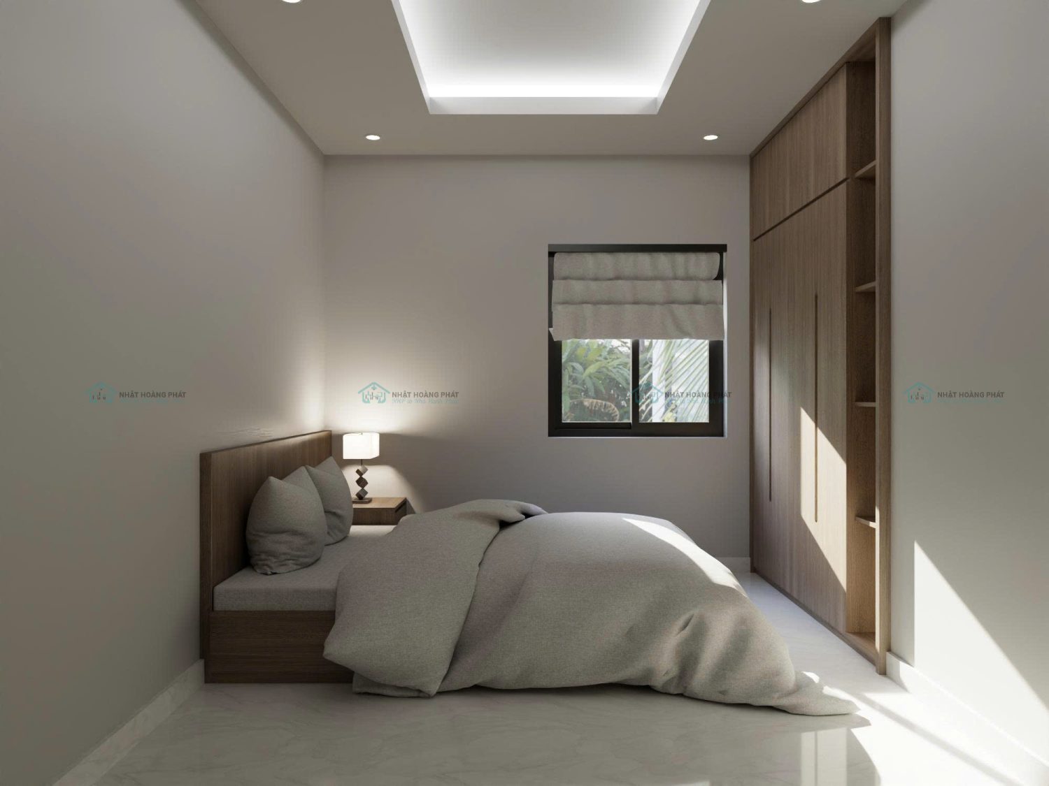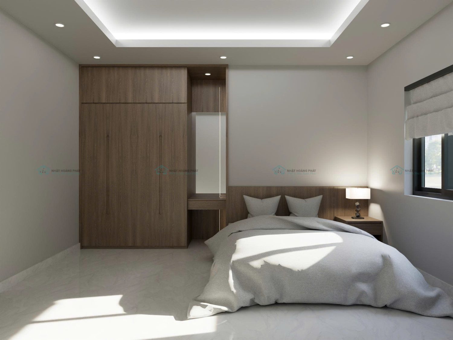 Thiết kế nội thất phòng ngủ được triển khai theo phong cách tối giản, tập trung vào sự thoải mái và khả năng lưu trữ thông minh.