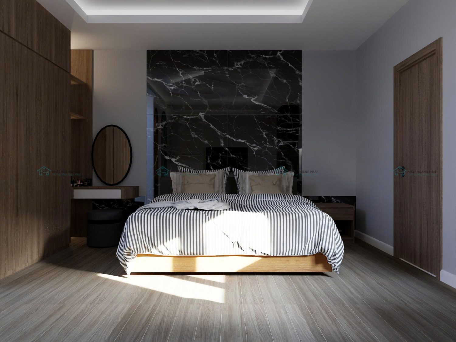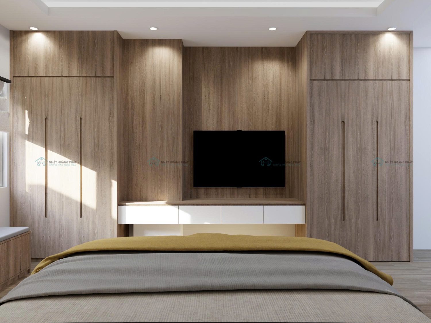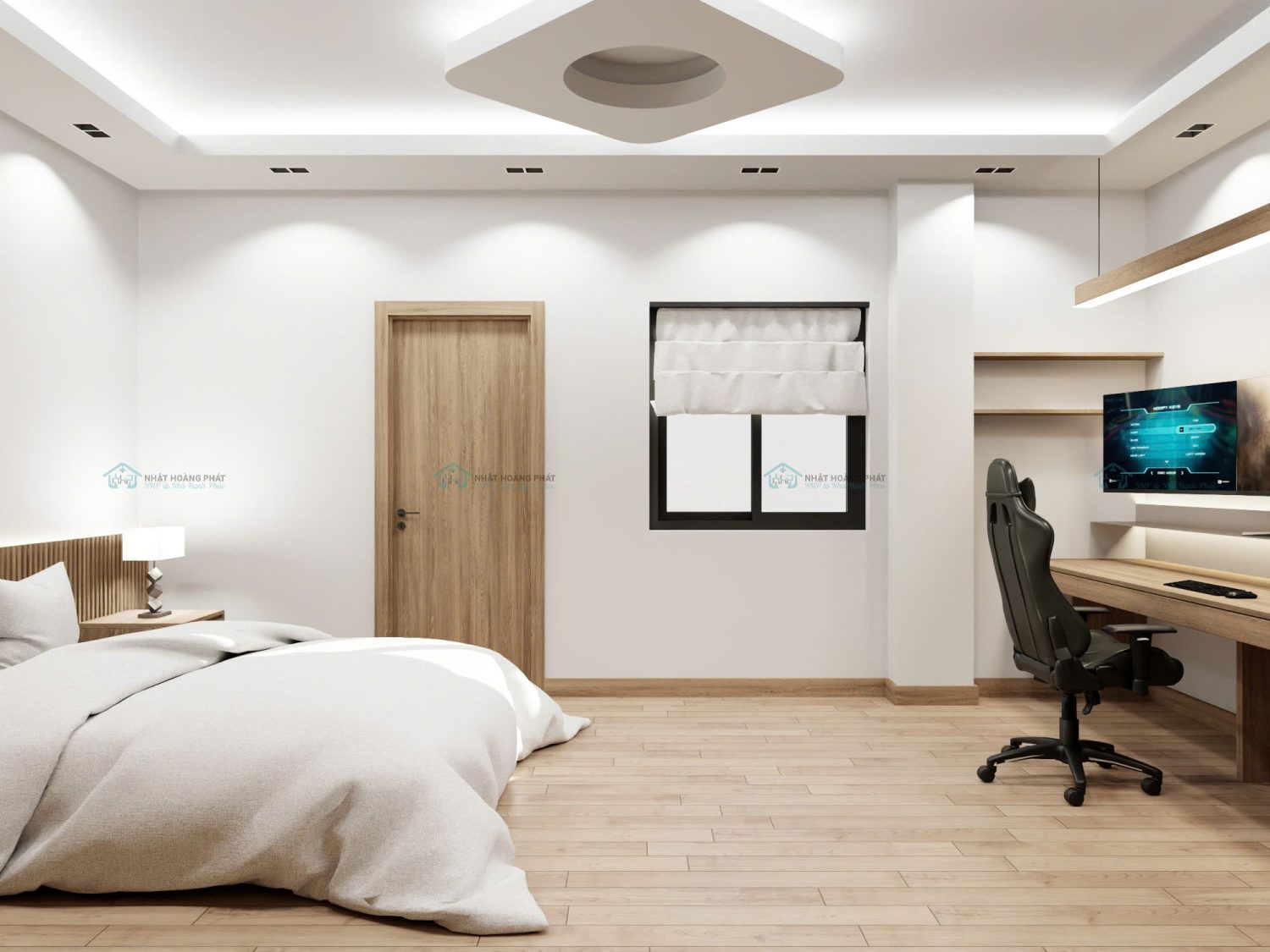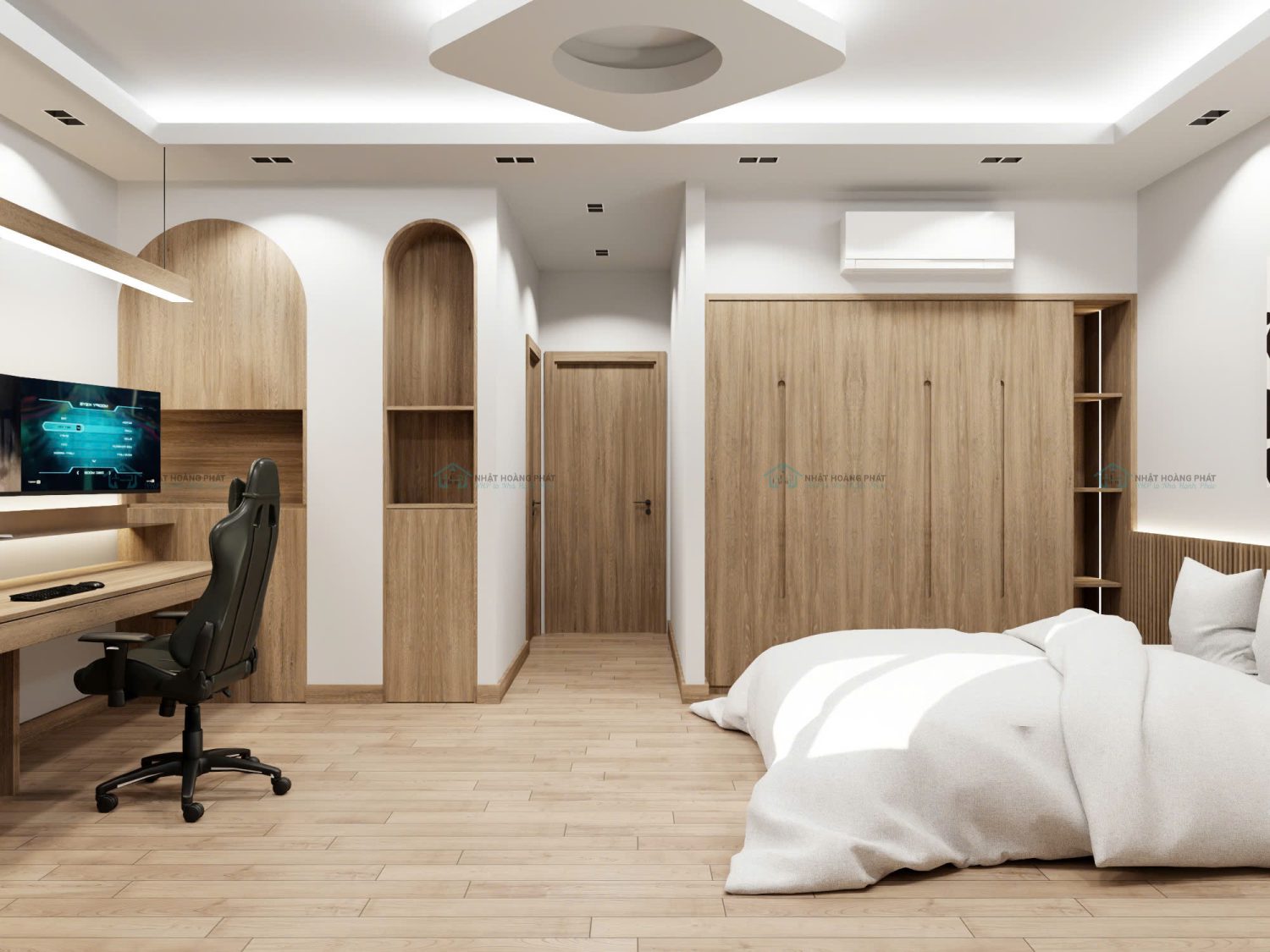 Thiết kế nội thất phòng ngủ được triển khai theo phong cách tối giản, tập trung vào sự thoải mái và khả năng lưu trữ thông minh.