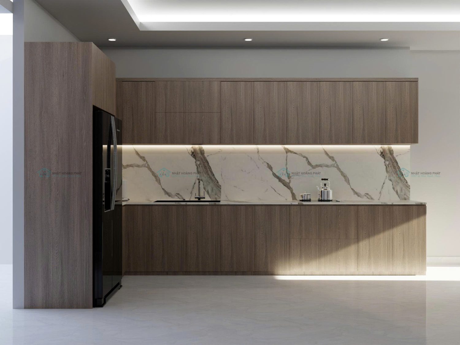 Màu sắc Melamine được lựa chọn theo tone vân gỗ sáng hoặc trung tính. Mang đến cảm giác sạch sẽ, thoáng sáng cho không gian nấu nướng.