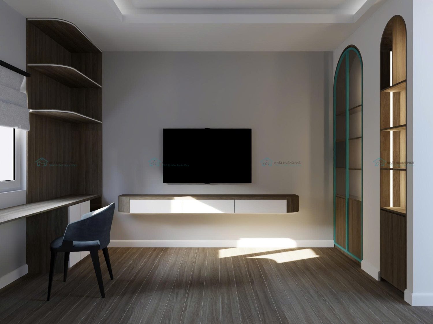 Bàn làm việc và kệ TV treo tường được cố định bằng khung thép âm tường. Giúp tiết kiệm diện tích mà vẫn đảm bảo chịu lực tốt.