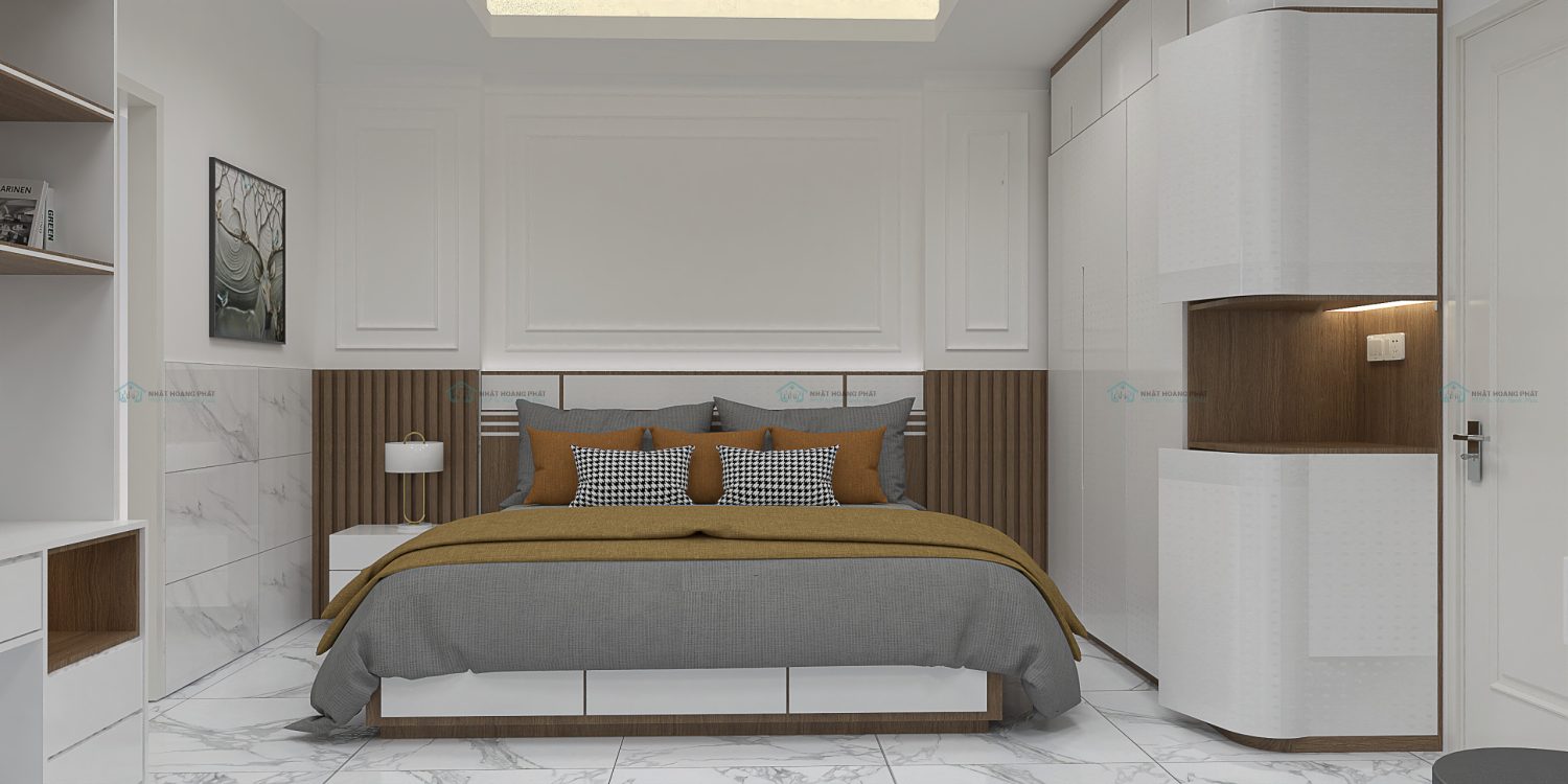 Phòng ngủ master: Thiết kế hiện đại, kết hợp tủ quần áo MDF cánh mở, bàn trang điểm gọn gàng.