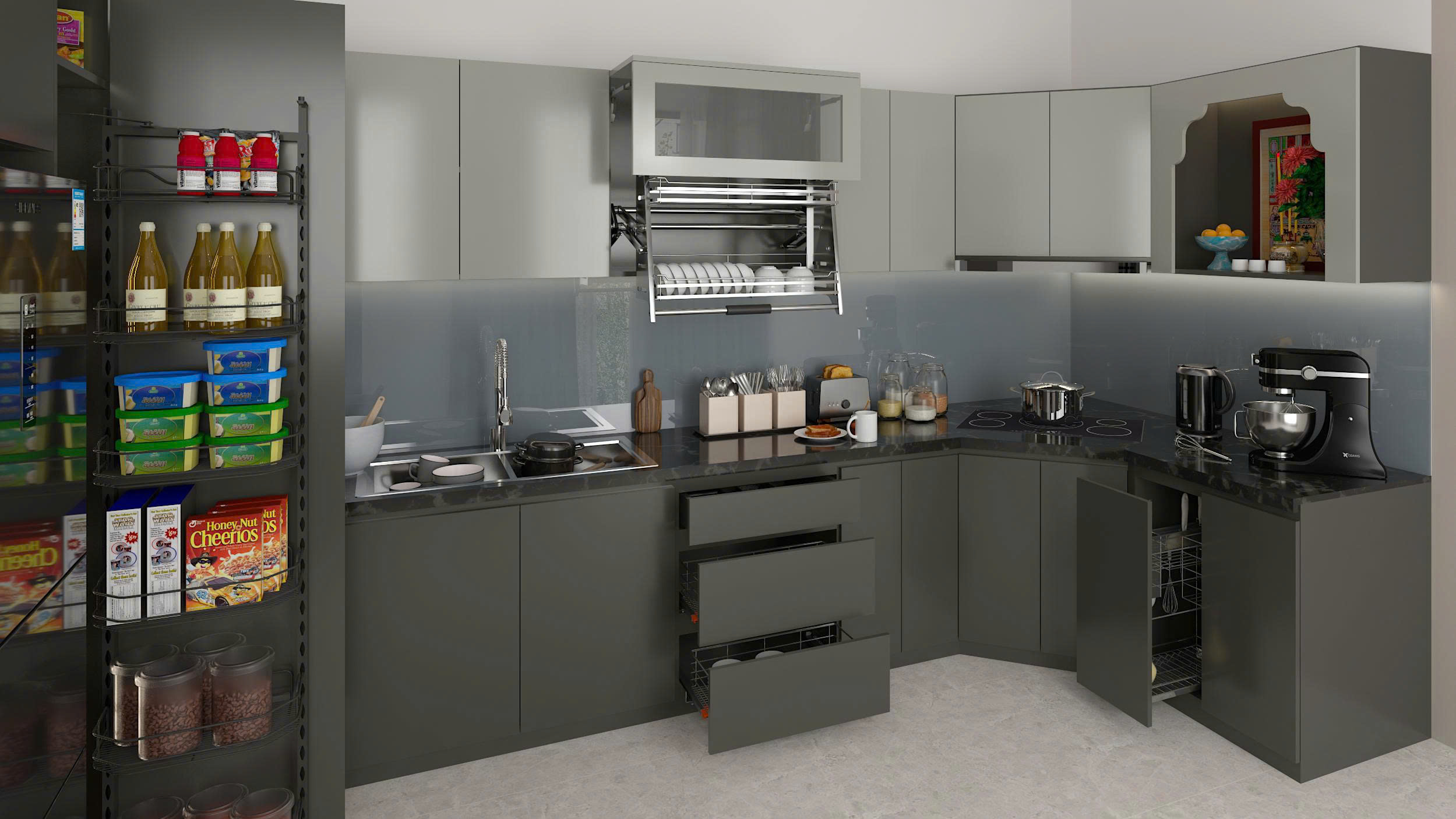 Các thiết kế tủ bếp Melamine hiện đại còn có thể tích hợp thêm phụ kiện thông minh như ray trượt, giá úp chén, thùng rác âm tủ, giúp việc nấu nướng trở nên nhẹ nhàng và khoa học hơn.