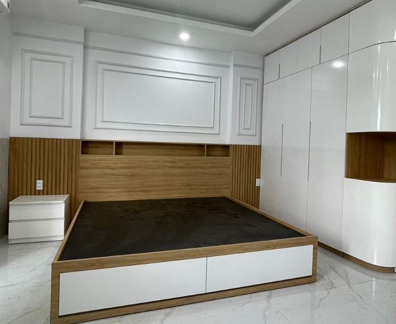 - Vai giường MDF chống ẩm dày 25mm, phủ Melamine, vạt giường 9mm phủ Melamine, thang giường sắt hộp 30x60x1,4mm.