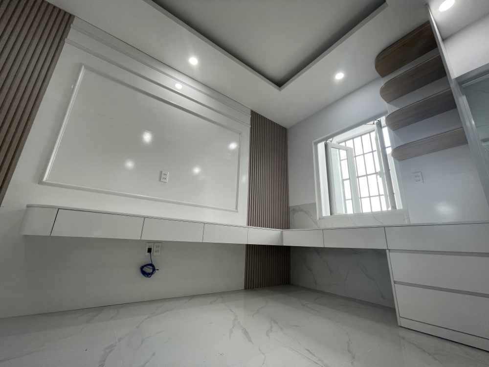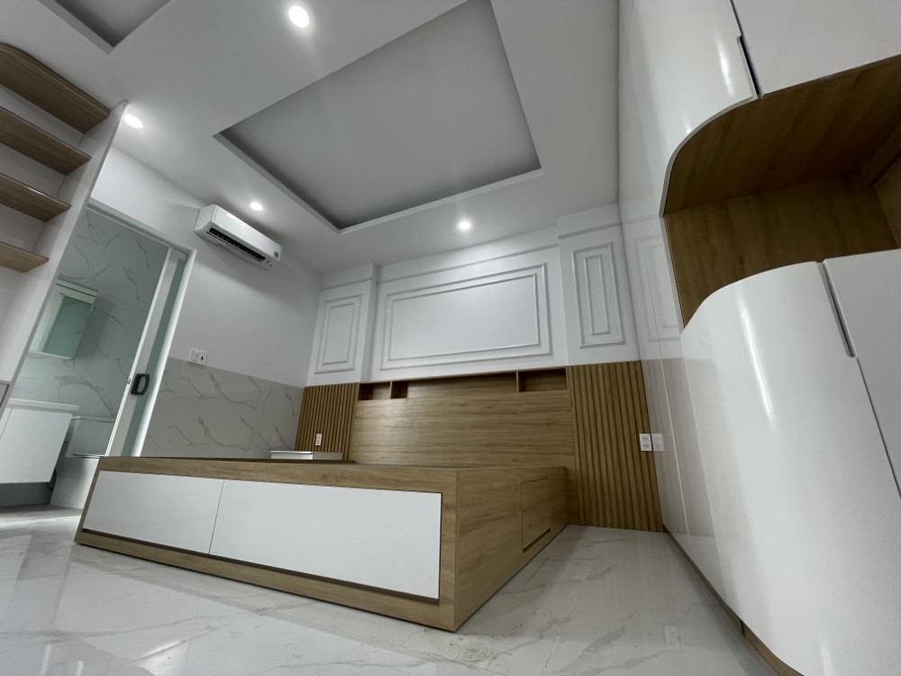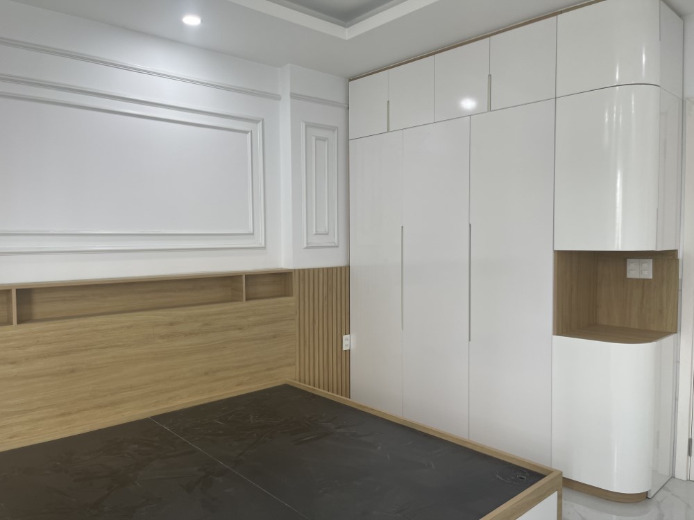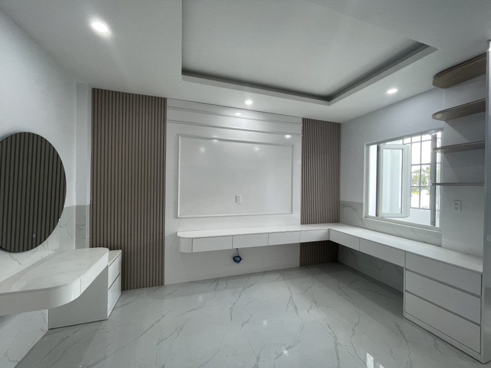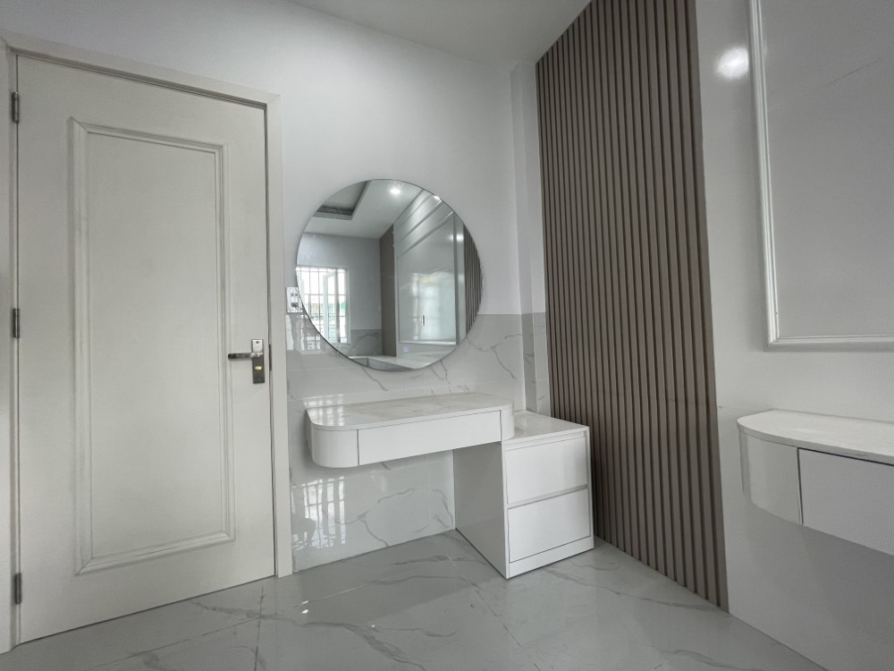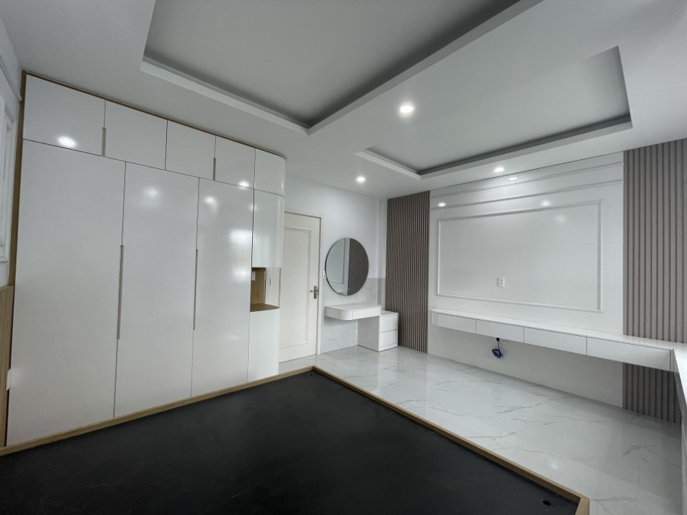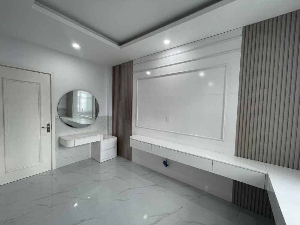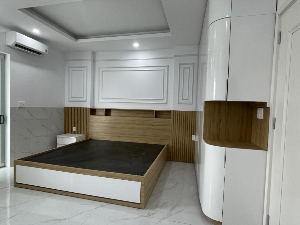 - Khung xương MDF chống ẩm, hoàn thiện bề mặt tấm PVC giả đá, ron nhôm mạ vàng.