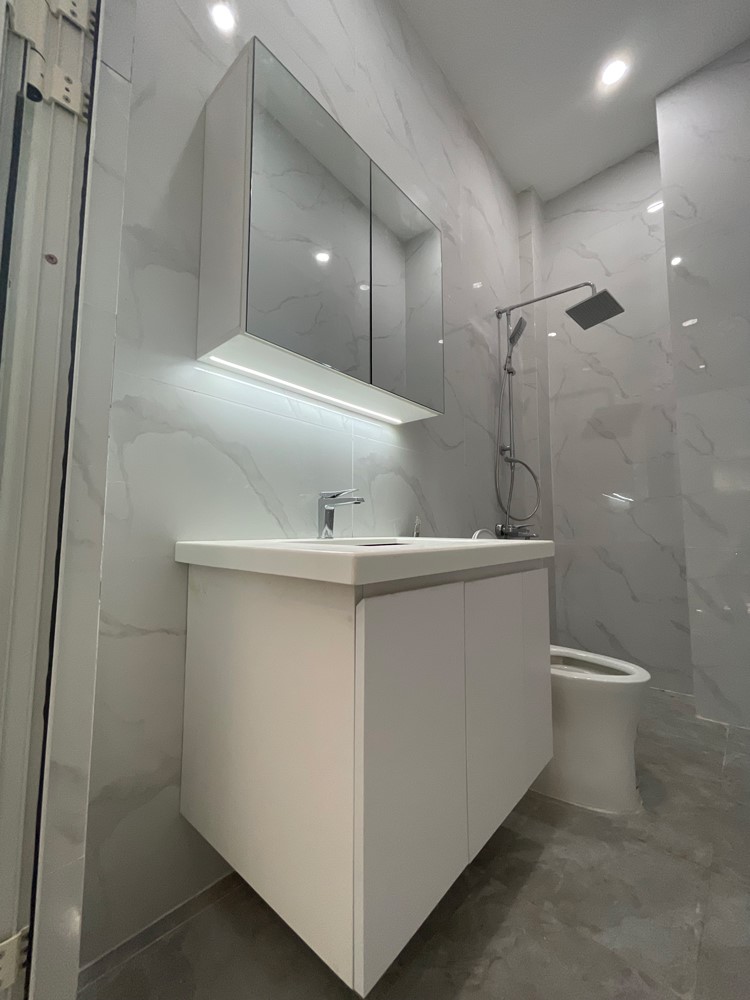 - Thùng và mặt cánh làm từ MDF chống ẩm phủ Melamine, phụ kiện tủ Hafele giảm chấn.