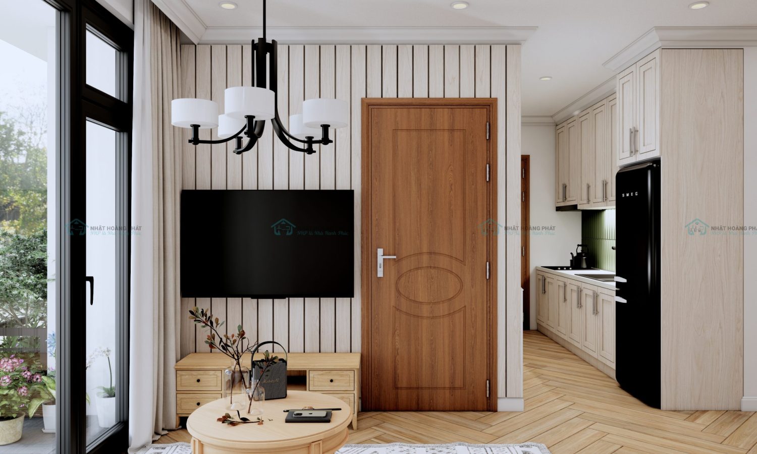 Phối cảnh cửa nhựa Composite cánh chạy huỳnh trang trí