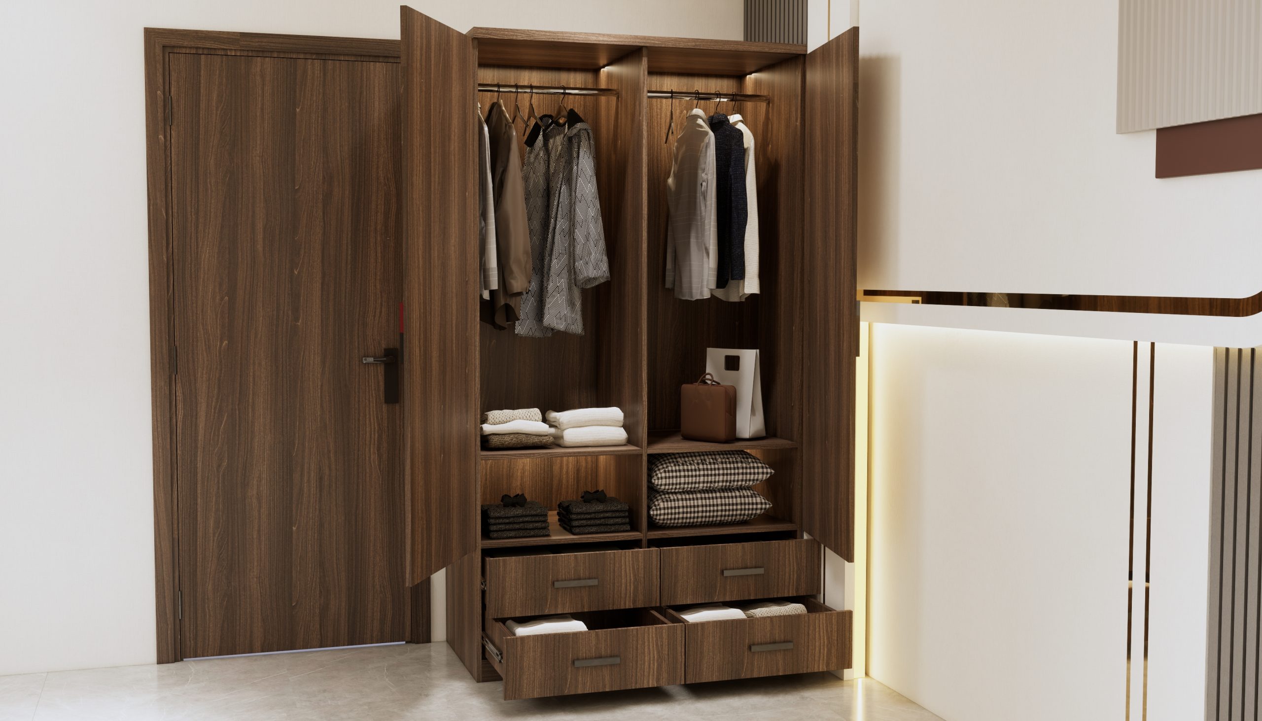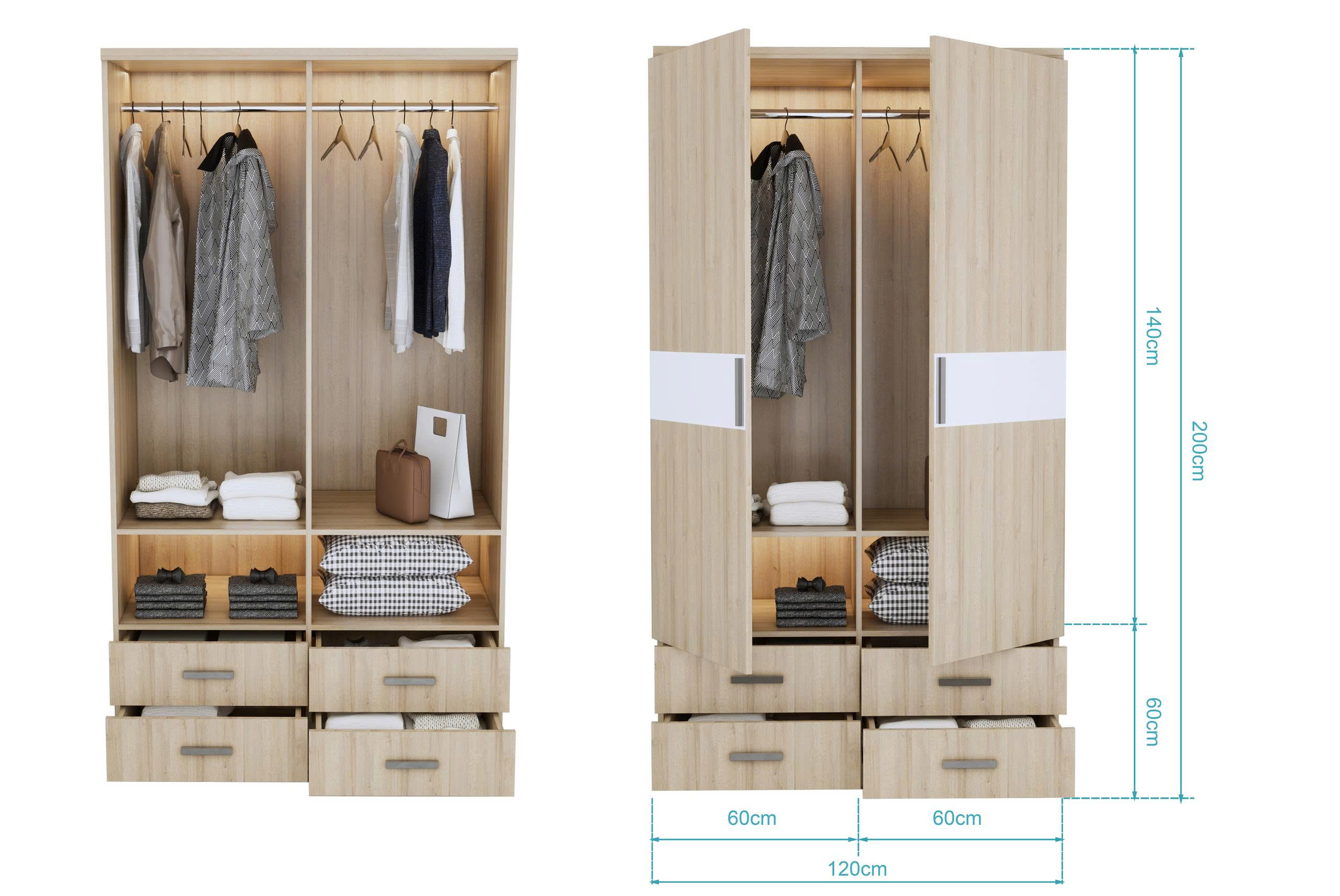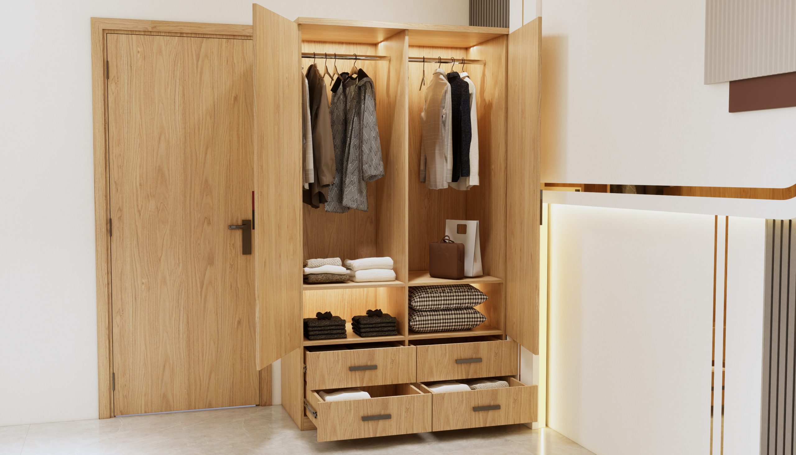 • Tủ quần áo được thiết kế hai cánh mở, bên dưới có 4 ngăn kéo tăng khả năng phân chia lưu trữ, phù hợp với phòng ngủ kích thước vừa và nhỏ như phòng ngủ trẻ em, phòng ngủ cho khách, phòng ngủ khách sạn, ...